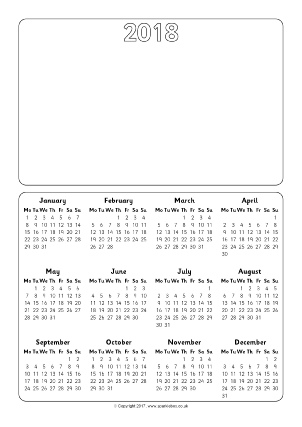 Simple printable 2018 calendars with a year to view. Three different sizes included. Great for use on pupil’s art and craft calendars.