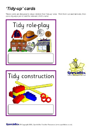 A set of cards showing different areas in your classroom that may need tidying. These can be given to children on a daily/weekly basis to make them responsible for tidying the classroom. Each card has space to write the child’s name.