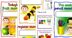A set of A4-sized printable signs for your child-oriented classroom notice board. Signs included for fruit monitor, register monitor, pencil monitor, classroom helper and more. Each sign has a space where you can write/stick the name of the day’s helper(s).
