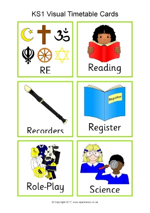 A colourful set of high-resolution JPG images featuring the main activities and subjects covered in Key Stage 2. Images can easily be resized to suit your needs. The download also includes a PDF document with the timetable images pre-arranged 6 to a page (A4).