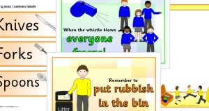 A set of A4-sized posters with pictures and words to promote good lunchtime manners.