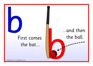 A set of posters for reminding children how to tell the difference between the letters ‘b’ and ‘d’ using a cricket bat and ball and a drum and stick