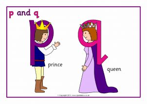 Simple A4-sized posters showing ‘p’ and ‘q’ the correct way round in a pictorial way
