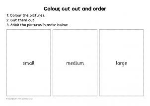 A set of simple sheets where pupils colour and cut out the pictures and then stick them in size order on their base sheet