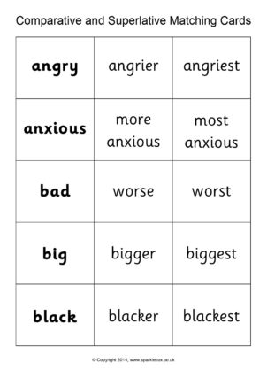 A set of simple printable word matching cards featuring regular and irregular comparatives and superlatives