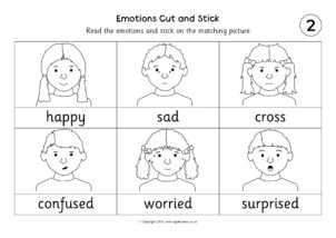 Differentiated worksheets where children cut out the facial expressions and stick them next to the corresponding words