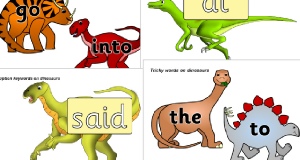Phonemes in cursive script presented on colourful cartoon dinosaurs.