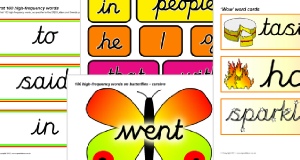 The first 100 high-frequency words in cursive script (as specified in the DfES ‘Letters and Sounds’ publication) presented on cards with brightly-coloured borders.