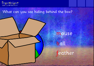 There’s something behind the box... but what? The children collect fish as they click on the word that matches the hidden object.
