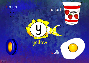 A teacher-controlled presentation for use with the whole-class or smaller groups. As the mouse is clicked, objects beginning with ‘y’ appear along with the accompanying words.