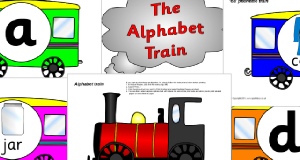 A printable train engine and carriages with the lowercase alphabet from a-z.