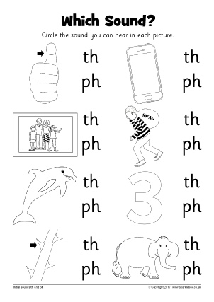 Simple worksheets where children circle the sound they hear - th or ph - in each picture.