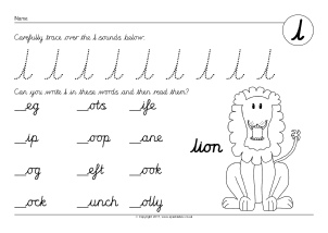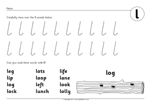 Simple printable worksheets where children can practise writing the phoneme 'l' and reading simple words with it. Each sheet also includes a picture to colour.