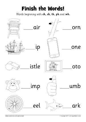 A worksheet where children complete the words by writing the initial sounds ch, sh, th, ph or wh.
