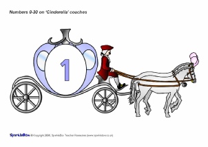 The numbers from 0 to 50 presented on coloured pumpkin ‘Cinderella’-style coaches.