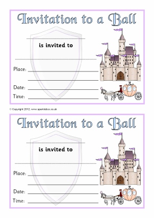Printable invitation to a ball writing frames. An ideal accompaniment to work on the story of Cinderella. Colour and black and white.