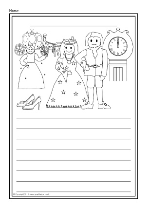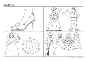 A set of simple printable sheets featuring images from the story of Cinderella for children to colour along with writing lines for story-related writing.