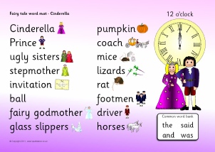 A printable A4-sized word mat with words and pictures linked to the fairytale of Cinderella.