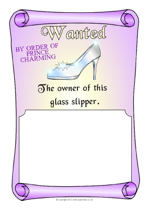 Printable wanted poster writing frames to help the prince find the owner of the glass slipper. Ideal for encouraging children to write descriptions of Cinderella.