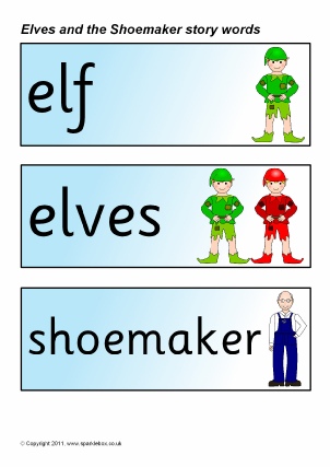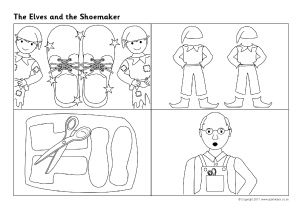 A set of A4-size printable visual aids for use when telling the story of The Elves and the Shoemaker. It includes pictures of the characters and large text to aid participation. Can also be printed for use on classroom displays or laminated for story sequencing activities.