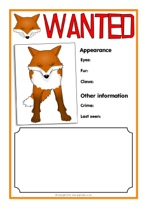 Printable wanted poster writing frames featuring a fox. Ideal for linking to the story of the Gingerbread Man. Children can write descriptions of the fox and what reward can be claimed.