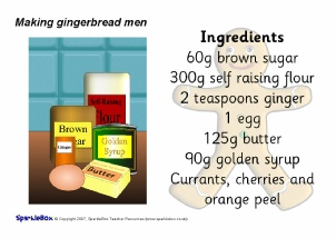 A useful set of simple visual aids showing how to make Gingerbread Men in 9 steps. It includes instructional text and a list of ingredients. Perfect for use in a classroom display.
