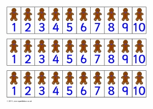 A PDF document with printable gingerbread men-themed 1-10 and 1-20 number tracks.