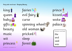 A printable A4-sized word mat with words and pictures linked to the fairytale of Sleeping Beauty.