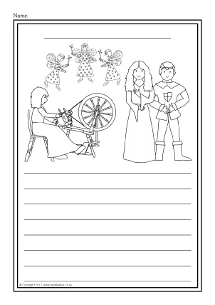 A set of simple printable sheets featuring images from the story of Sleeping Beauty for children to colour along with writing lines for story-related writing.