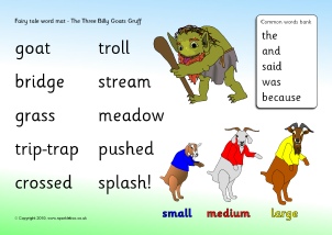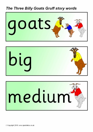 A set of printable word and picture cards linked to the story of The Three Billy Goats Gruff.