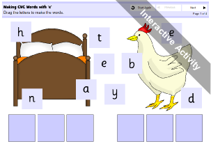 A simple click-and-drag activity ideal for whole-class teaching and using an interactive whiteboard.  Children drag the letters to make the CVC words below the corresponding pictures.