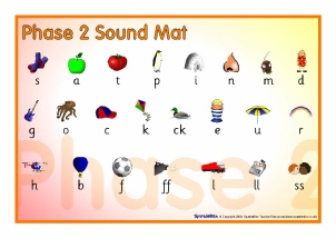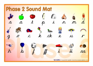 The phonemes for Phase 2, with pictures, presented on a printable table-top mat.