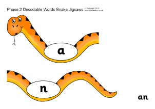 A set of jigsaws in the form of snakes. Children assemble the snakes to make the Phase 2 decodable words.