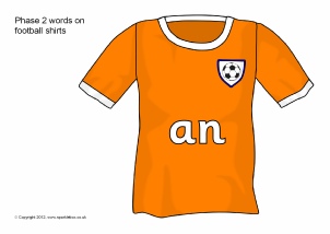 The Phase 2 high-frequency words presented on orange football shirts. Tricky words are in italics.