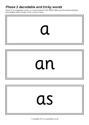 The decodable and tricky words for Phase Two as specified in the DfES Letters and Sounds publication.
