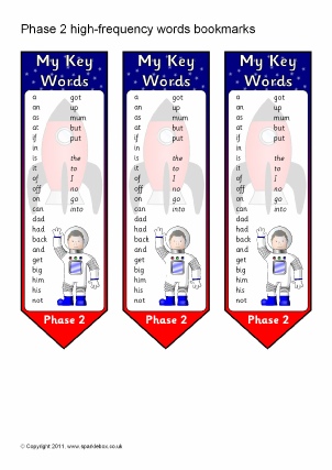 A set of printable bookmarks with various different themes listing Phase 2 high-frequency words.