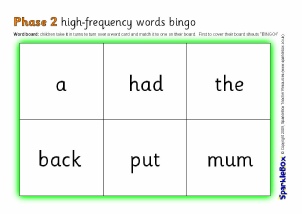 A simple bingo game featuring the Phase 2 high-frequency words, as specified in the DfES ‘Letters and Sounds’ publication.