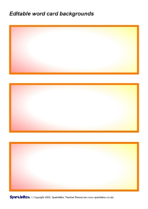 A set of coloured editable word card background templates for Microsoft Word. Includes orange, purple, green, pink and red - the colours of Phases 2-6 from the DfES ‘Letters and Sounds’ publication.