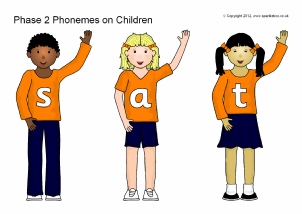 The Phase 2 phonemes presented on waving children.