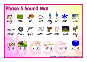 The phonemes for Phase 5, with pictures, presented on a printable table-top mat.