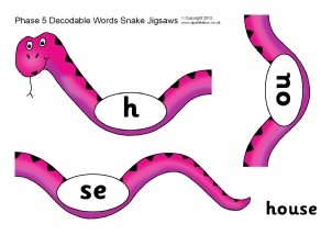 A set of jigsaws in the form of snakes. Children assemble the snakes to make the Phase 5 decodable words.