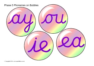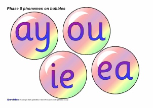 The additional phonemes for Phase 5, as specified in the DfES ‘Letters and Sounds’ publication, presented on bubbles.