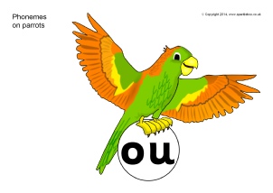 The Phase 5 suggested phonemes presented on different coloured cartoon parrots.