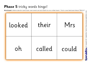 A set of bingo boards and cards featuring the nine Phase Five tricky words in the DfES Letters and Sounds document.