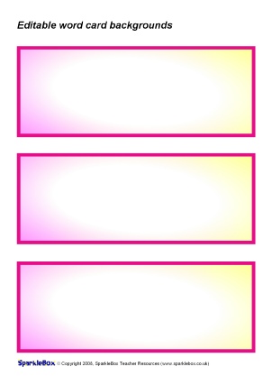 A set of coloured editable word card background templates for Microsoft Word. Includes orange, purple, green, pink and red - the colours of Phases 2-6 from the DfES ‘Letters and Sounds’ publication.