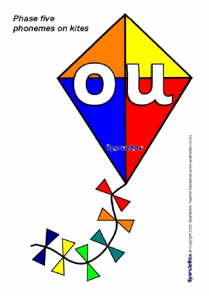 The lowercase Phase 5 phonemes, as specified in the DfES ‘Letters and Sounds’ publication, presented on brightly-coloured kites.