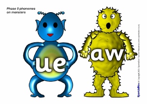 The Phase 5 phonemes specified in the DfES ‘Letters and Sounds’ publication, presented on brightly-coloured monster characters.