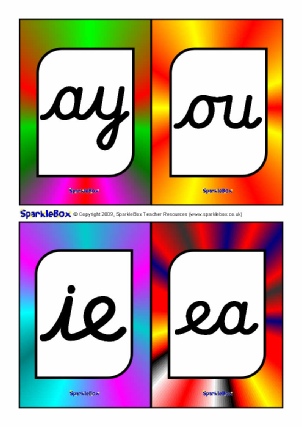 A useful set of brightly-coloured printable cards (4-to-a-page) with the additional Phase 5 phonemes specified in the DfES ‘Letters and Sounds’ publication in cursive script.