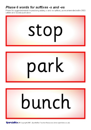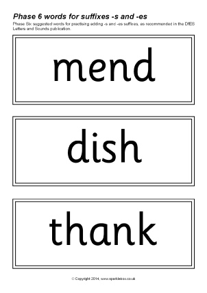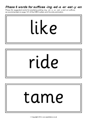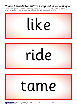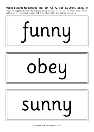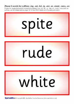 The suggested words for Phase Six practising adding the suffixes -ing, -ed, -ful, -ly, -est, -er, -ment, -ness, -en, as outlined in the DfES ‘Letters and Sounds’ publication.