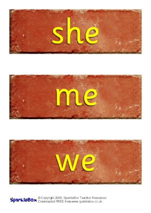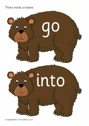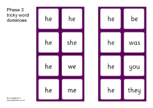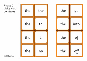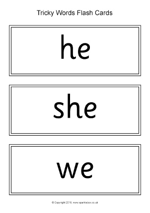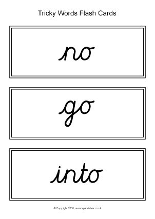 The tricky words (as specified in the DfES ‘Letters and Sounds’ publication) presented on cards with brightly-coloured borders.